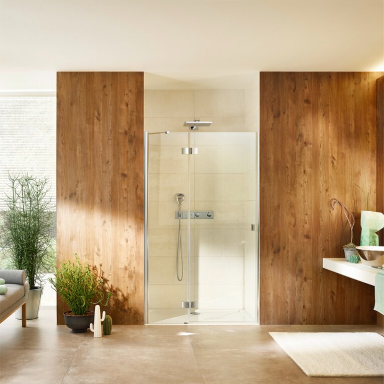 Die außen mit zertifizierter Klebtechnik verklebten Scharniere machen die Reinigung der Glasinnenseite besonders leicht. Einfach die durchlaufende Glasfläche nach dem Duschen mit einem Wischer abziehen oder - falls mit ARTCLEAR GLAS veredelt - nur abspülen.