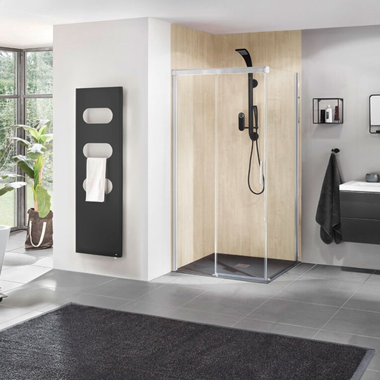 Exrtraschmal und aufs Maximum reduziert ist das patentierte Türführungs-System der MOVE. Besonders praktisch: Die Duschtüren sind mit Magneten fixiert und können zum Reinigen einfach weggeschwenkt werden.